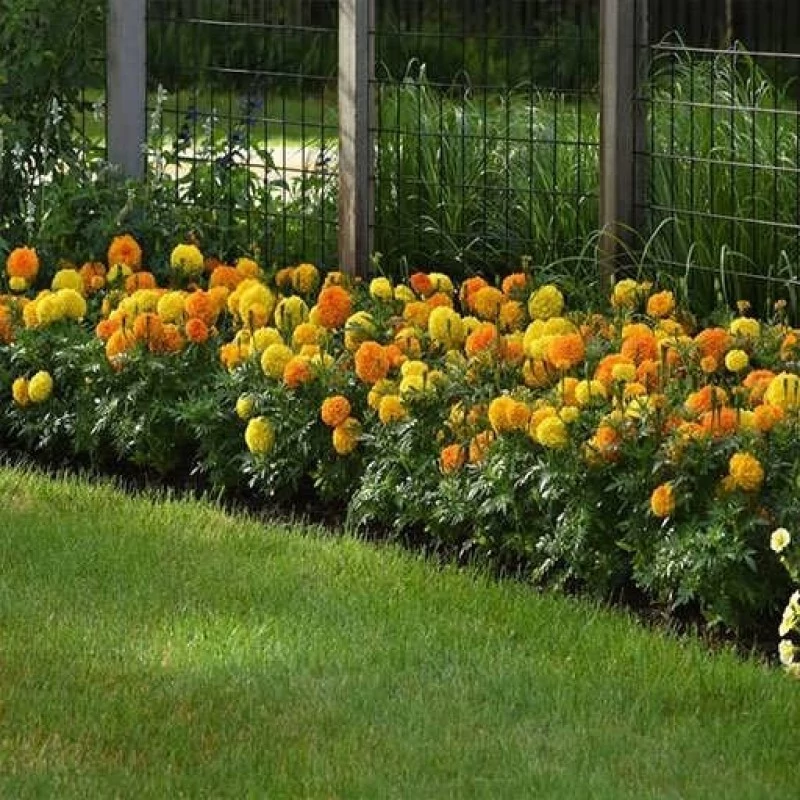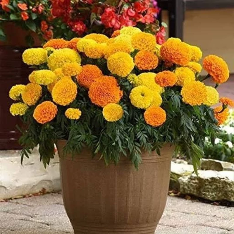 گل جعفری پابلند پرپر گل درشت با ترکیب رنگ زرد و نارنجی، جزو واریته های بسیار محبوب و ارزشمند از گروه Tagetes erecta (جعفری آفریقایی) است که به دلیل قامتی بلند، گل های بسیار بزرگ و پرپر و مقاومت عالی، نه تنها در زیباسازی باغچه های خانگی، بلکه در فضای سبز شهری و باغ های تزئینی در سراسر دنیا استفاده می شود. این واریته با ارتفاع قابل توجه، ساقه های قوی و گل هایی همچون توپ ابریشمی در طیف زرد تا نارنجی، حضور برجسته ای در ترکیب های فضاسازی ایجاد می کند و یکی از بهترین گزینه ها برای کاشت ردیفی، زمینه سازی جهت گیاهان کوتاه تر و ایجاد پرسپکتیو رنگی در باغ است. جعفری پابلند با گلدهی طولانی، سازگاری بالا به نور و گرما و پایین بودن نیاز مراقبتی، راه حل ایده آلی برای ایجاد باغچه ای چشم نواز و پُرگل با حداقل نگهداری به شمار می رود. ضمن اینکه بوی برگ و گل هایش تا حدی خاصیت دفع طبیعی برخی آفات همچون شته و پشه را نیز دارد. مشخصات ظاهری گل جعفری پابلند پرپر گل درشت مخلوط زرد و نارنجی ارتفاع این واریته به طور معمول 60 تا 90 سانتی متر و گاه حتی تا 100 سانتی متر می رسد و قطر بوته حدود 30 تا 45 سانتی متر است.ساقه ها ضخیم، محکم و نیمه مستقیم رشد می کنند و تعداد قابل توجهی شاخه جانبی قدرتمند در نقاط مختلف بوته ظاهر می شود.فرم کلی بوته اغلب بیضوی ایستاده یا نیمه کروی و کاملاً پر و متراکم است. ساقه اصلی و شاخه ها توان نگهداری گل های سنگین را حتی در روزهای بادخیز دارند که باعث نمی شود بوته خم شود یا آسیب ببیند. برگ ها سرخسی شکل، دارای بریدگی های عمیق و به رنگ سبز تیره تا متوسط می باشند که میل به سبز براق دارند.این برگ ها نسبتاً بلند، پهن تر از برگ جعفری های پا کوتاه و کاملاً متراکم بر روی ساقه ها قرار دارند و زمینه ای سبز و قوی برای نمایش گل های بزرگ فراهم می کنند.برگ ها رایحه ای تلخ و خنک دارند که با لمس یا خردشدن، آن را بیشتر آزاد می کنند و به عنوان عامل دورکننده طبیعی برخی آفات عمل می نمایند.