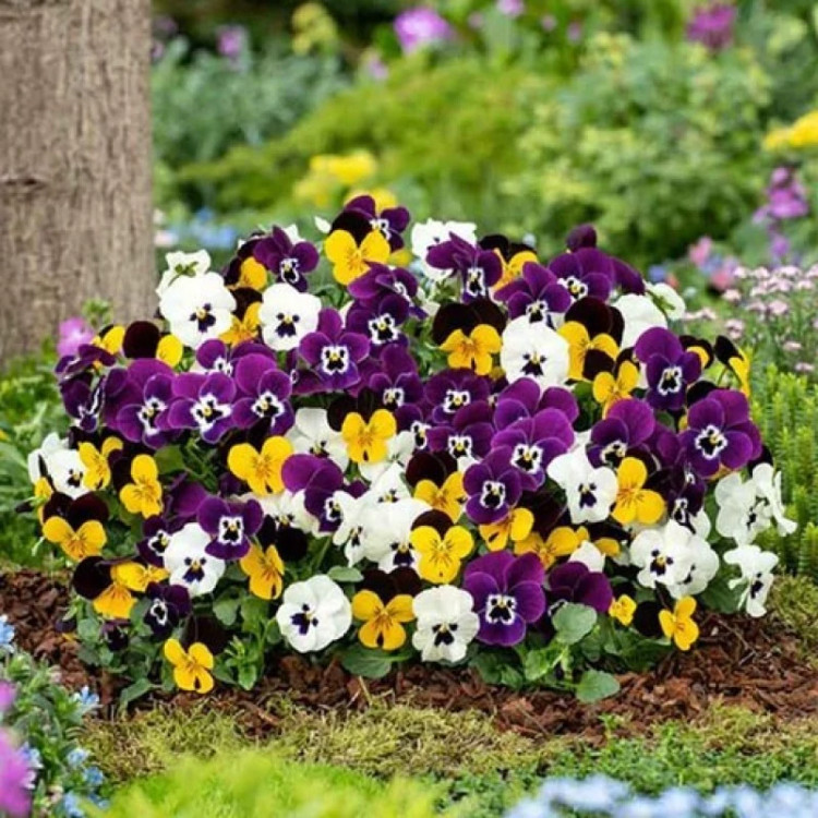 گل بنفشه گل درشت الوان یکی از محبوب ترین گل های فصلی زینتی در سراسر دنیا و ایران است که به دلیل گل های درشت و مخلوط رنگارنگ، ماندگاری نسبی بالا، قدرت سازگاری با اقلیم های مختلف و گل دهی طولانی مورد توجه طراحان فضای سبز و باغچه های خانگی قرار دارد. این واریته با تنوع رنگ چشمگیر، شامل ترکیبی از بنفش، زرد، سفید، صورتی، آبی، قرمز و حتی نمونه های دولبه یا سه رنگ، جلوه ای بی نظیر به فضای سبز می بخشد. گل های درشت این گروه قطر تقریبی 6 تا 10 سانتی متر دارند و در طول پاییز، زمستان (در مناطق گرم) و بهار تا اوایل تابستان، بستری رنگارنگ برای باغچه، گلدان، تراس و فضاهای شهری ایجاد می کنند. این گونه اغلب به صورت یک ساله یا دو ساله کشت می شود و به واسطه سازگاری خوب با سرما، برای کاشت پاییزه بسیار مناسب است. بوته های گل بنفشه نسبتاً کوتاه بوده و رشد آرام دارند، اما قدرت گلدهی فراوان نشان می دهند. مراقبت و کشت آسان، رشد نسبتاً سریع، مقاومت به هوای خنک، و عمر طولانی گل ها در آب و هوای معتدل مهم ترین ویژگی های این گروه به شمار می رود. مشخصات ظاهری گل بنفشه گل درشت الوان بوته گل بنفشه گل درشت الوان دارای ساقه های کوتاه، ضخیم و نسبتاً منشعب است که معمولاً ارتفاعی در بازه 15 تا 25 سانتی متر و قطر یا گسترش حدود 20 تا 30 سانتی متر دارند. برگ ها تخم مرغی تا مستطیلی، با لبه کمی دندانه دار و سبز تیره هستند که سطح بوته را یکدست و متراکم می پوشانند. شاخساره های جانبی قوی باعث افزایش تراکم و حجم بوته می شوند. سیستم ریشه کوتاه اما گسترده است که باعث استقرار مناسب بوته حتی در خاک های سطحی و گلدانی می شود. گل ها بزرگ، گرد و پهن و معمولاً با پنج گلبرگ مخملی ضخیم دیده می شوند. رنگ گل ها بسیار متنوع است: ترکیبی از بنفش، زرد، سفید، آبی، صورتی، قرمز، نارنجی و نمونه های دولبه یا سه رنگ با نقش و نگارهای خاص (مانند لکه تیره در مرکز گل که به چشم بنفشه معروف است). قطر هر گل معمولاً 6 تا 10 سانتی متر بوده و به واسطه بافت مخملی و درخشش خاص گلبرگ ها، جلوه ای ویژه دارد. هر بوته غالباً همزمان چند گل باز دارد و جریان گل دهی تا مدت ها ادامه می یابد.